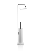 Pure Form, pures Material. Die weißmatte Stand WC Garnitur aus dem präzisen Verbundmaterial Mineralguss, der komplett durchgefärbt ist, steht für absoluten Softpurismus, der sich jedem Stil anpasst. Die weich fließende Oberfläche der Bürstengarnitur erhält mit dem passenden Bürstenstil in glänzendem Chrom einen schmeichelnden Mini Kontrast, der optisch seine dezente Wirkung entfaltet. Der integrierte Toilettenpapierhalter asu gebürstetem Edelstahl vervollständigt die puristische Perfektion des praktischen Bad Sets.